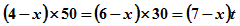 ,解方程,(4-x):(6-x)=30:50=3:5,比例相差2份,(4-x)与(6-x)相差2,1份对应1,则(6-x)=5,(7-x)=6,5×30=6t,t=25。选择D选项。